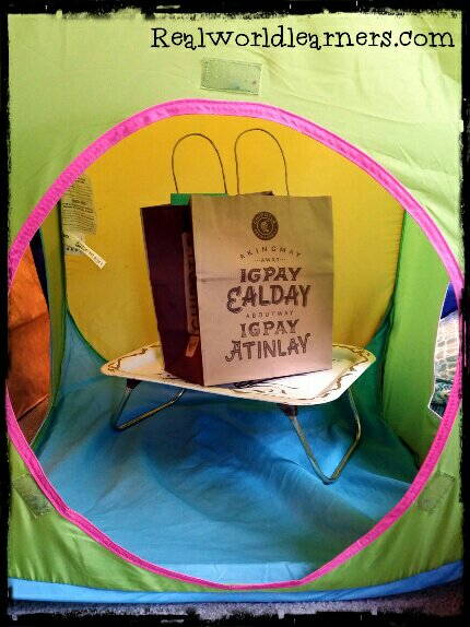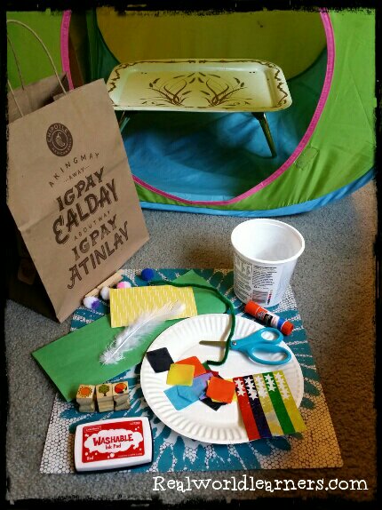 I brought out our pop-up tent (we got this one from IKEA) and set up a tv tray inside it with the craft-kit-bag on top. You could create a “kiosk” (or some type of special space to make this seem like an out-of-the-ordinary moment for your kids) by corning off part of the room with a pillow barrier or draping a bed sheet over a table and setting up a work space underneath.