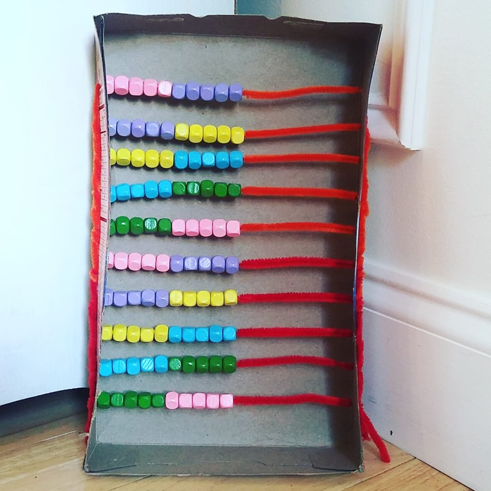 If you’d like to try a DIY version, you can make one pretty easily with materials from a dollar store. Here’s a picture of one we made with a cereal box, pipe cleaners, and beads. I also saw one made with an empty photo frame, skewers, and plastic straws cut into small pieces (to use as the beads).